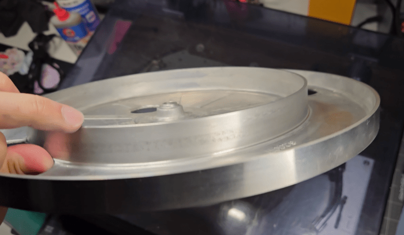 With the platter removed, you can see the dry rotted rubber belt that I would need to scrap off and clean before anything else. For the most part, everything looked fine and spins okay.