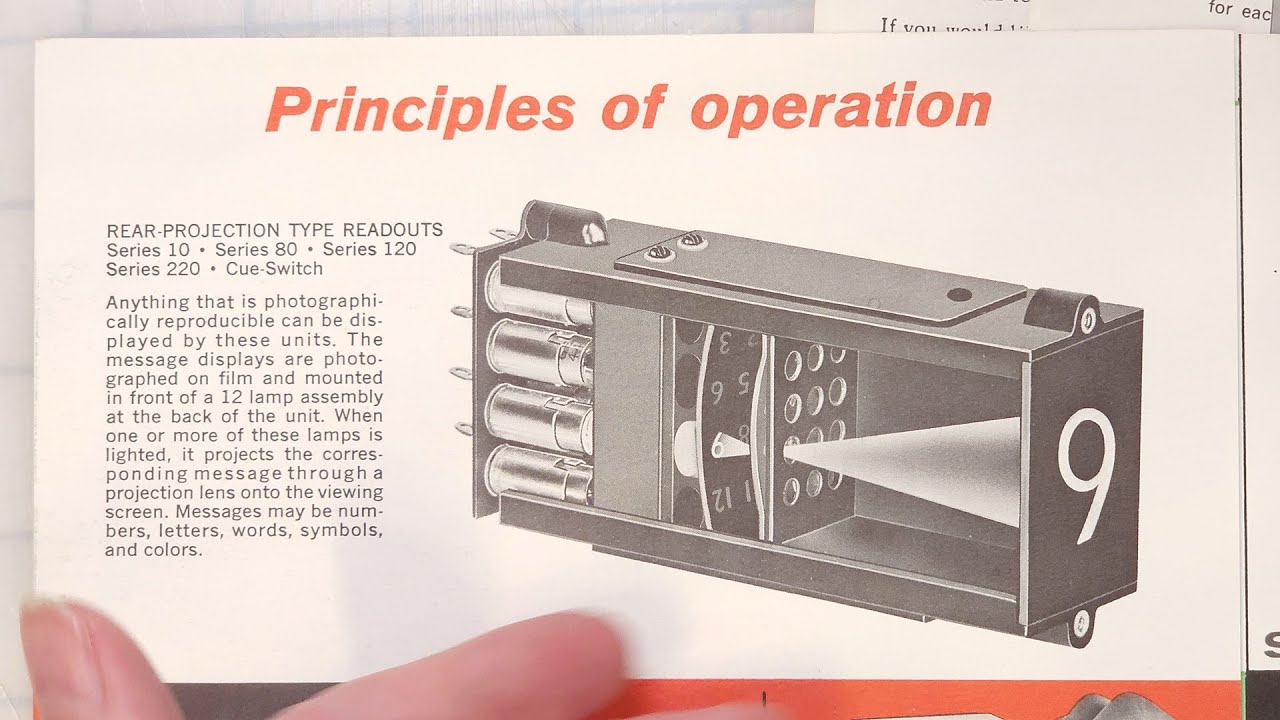 The following model here is a IEE One-Plane projection display (also known as in-line displays), invented in 1956 primarily for use in industrial controls. Each character is projected from a light that shines through a mask of any pattern inscribed into it such as digits or industrial warnings. Chunky but does produce a clean analog image.